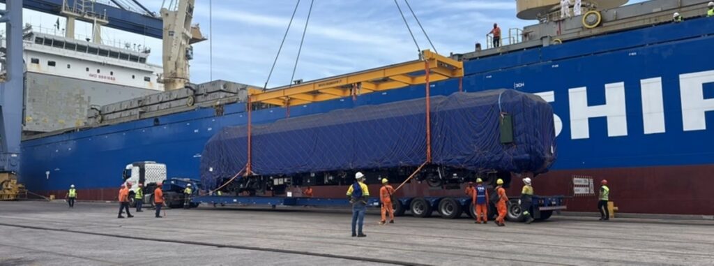 Diretamente da China, o primeiro entre os novos trens do metrô de Belo Horizonte desembarcou em solo brasileiro nessa terça-feira (13/1). A composição chegou pelo Porto de Itaguaí, no Rio de Janeiro, e seguirá para Belo Horizonte nos próximos dias, após a liberação alfandegária.