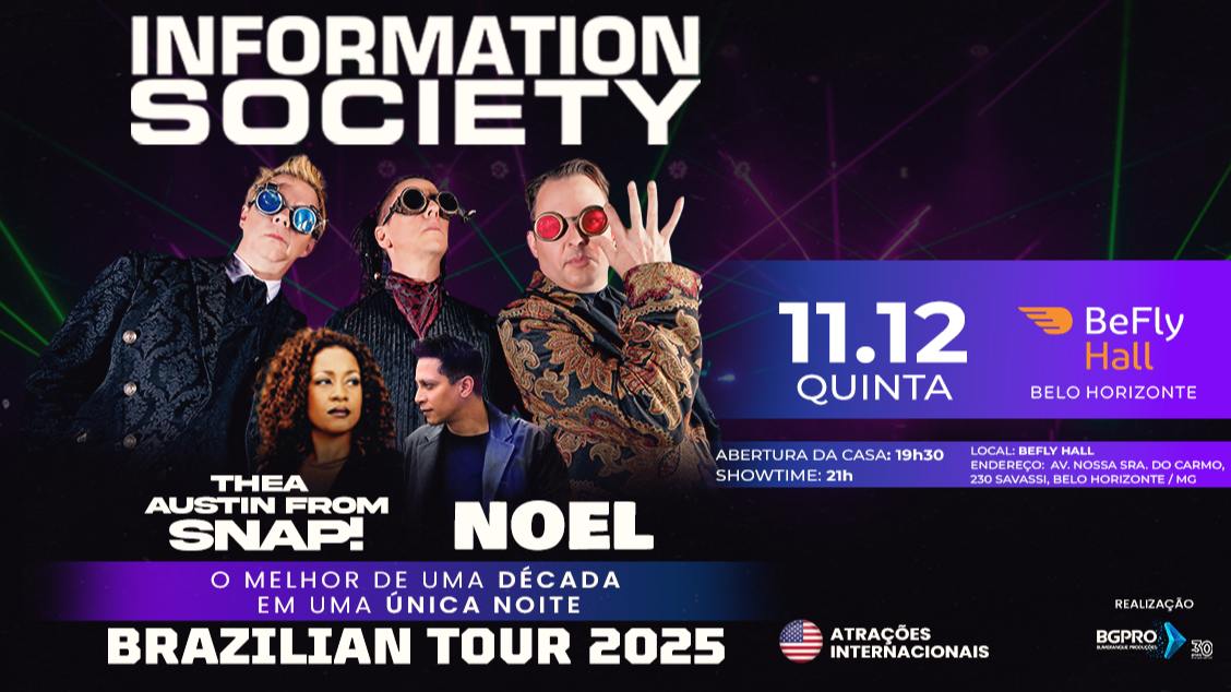 Information Society, Thea Austin (SNAP!) e Noel SERVIÇO: LOCAL:  BEFLY HALL - AV. NOSSA SRA. DO CARMO, 230 - SAVASSI - BELO HORIZONTE / MG DATA E HORÁRIO: 11 DE DEZEMBRO, QUINTA FEIRA. ABERTURA DOS PORTÕES: 19:00. SHOW: 21:00. CLASSIFICAÇÃO ETÁRIA: 18 anos